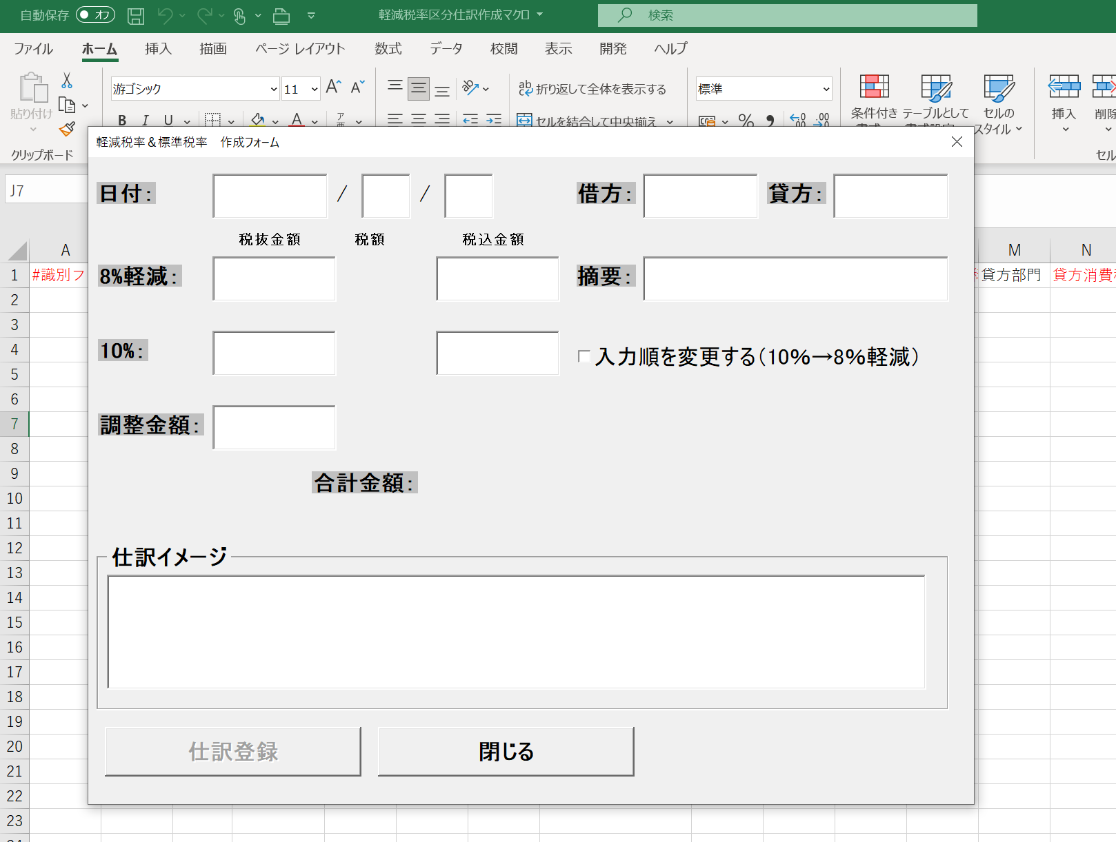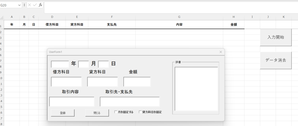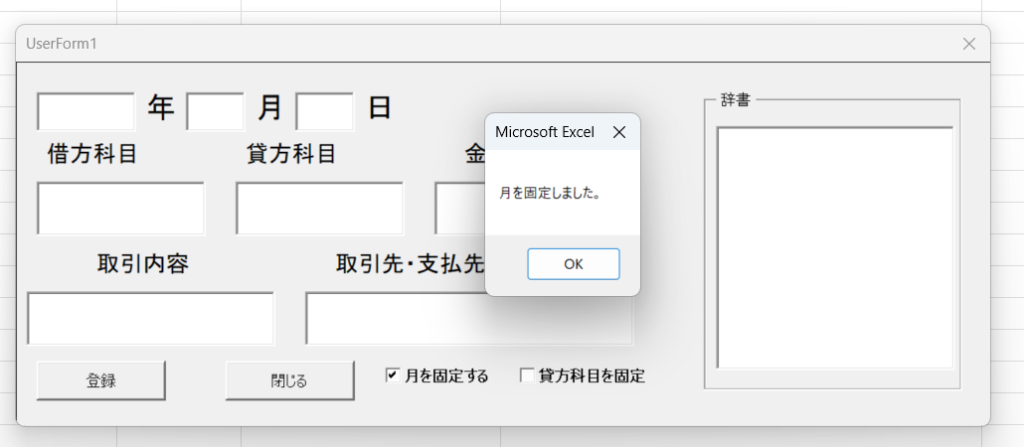 ユーザーフォームのチェックボックス機能で日付と勘定科目を固定する機能を追加する
