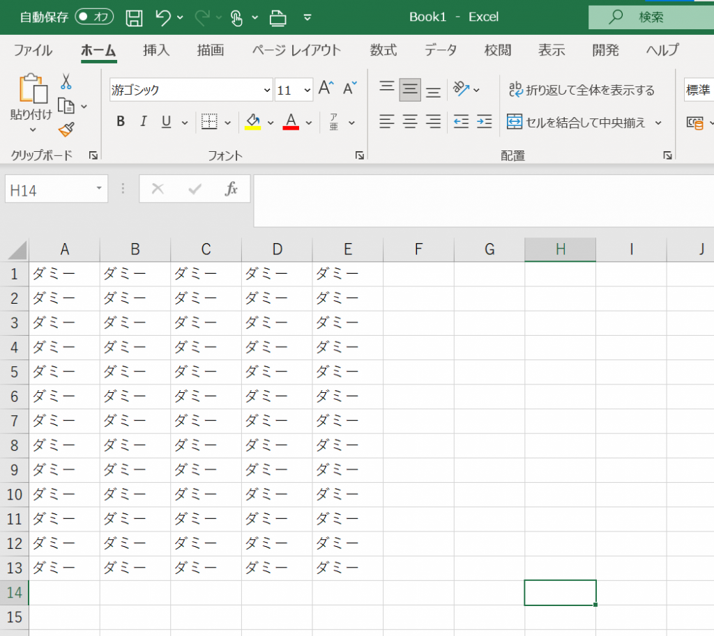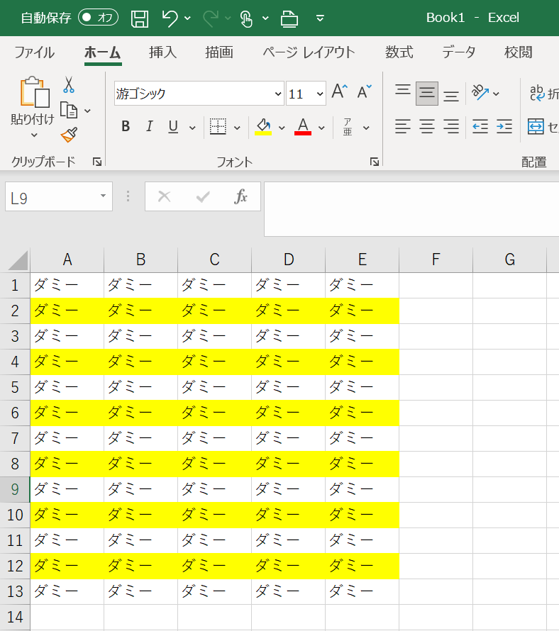 今回はこんなデータがあった場合に1行ごとに色を変える方法を考えていきます。