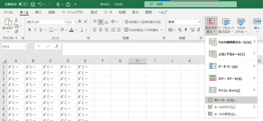 Excelの「ホーム」タブから「条件付き書式」へ進み「新しいルール(N)」をクリック↓
