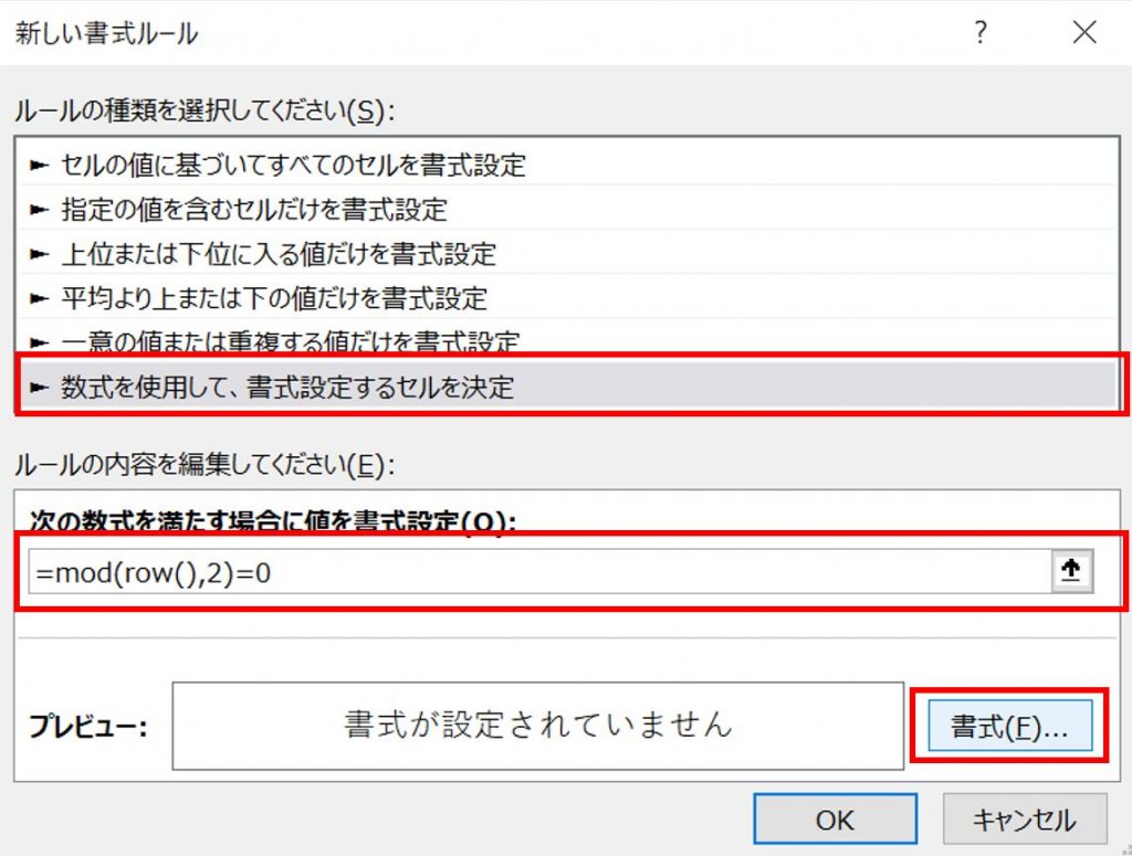 クリック後に下記の画面が表示されるので「数式を使用して、書式設定するセルを決定」を選択して「=mod(row(),2)=0」と入力して「書式(F)」をクリック↓