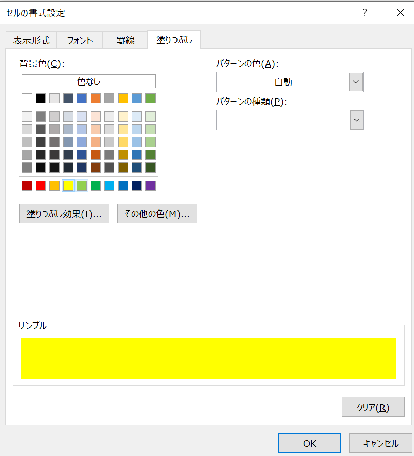 書式設定画面の「塗りつぶし」タブから好きな色を選択してOKボタンをクリック↓