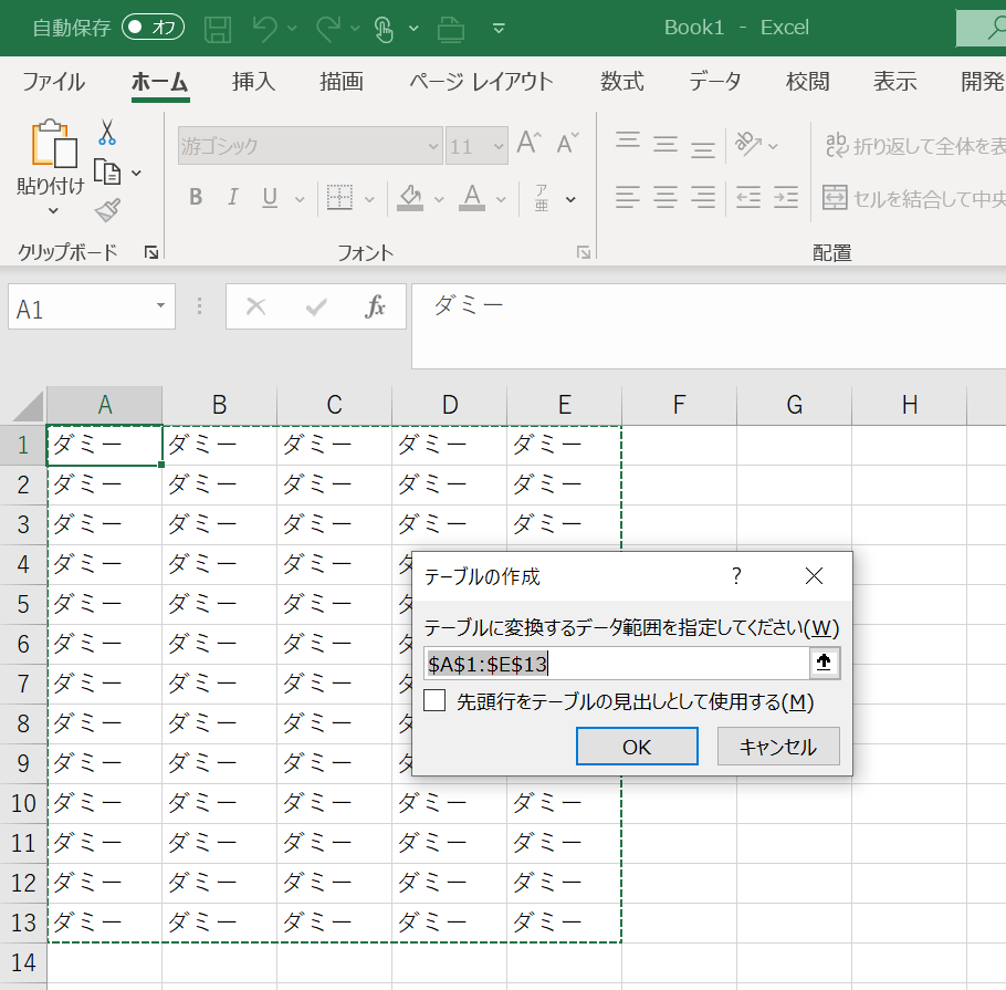 データがあるセルで「ctrl+T」を押すと「テーブルの作成」ダイアログが表示されます↓