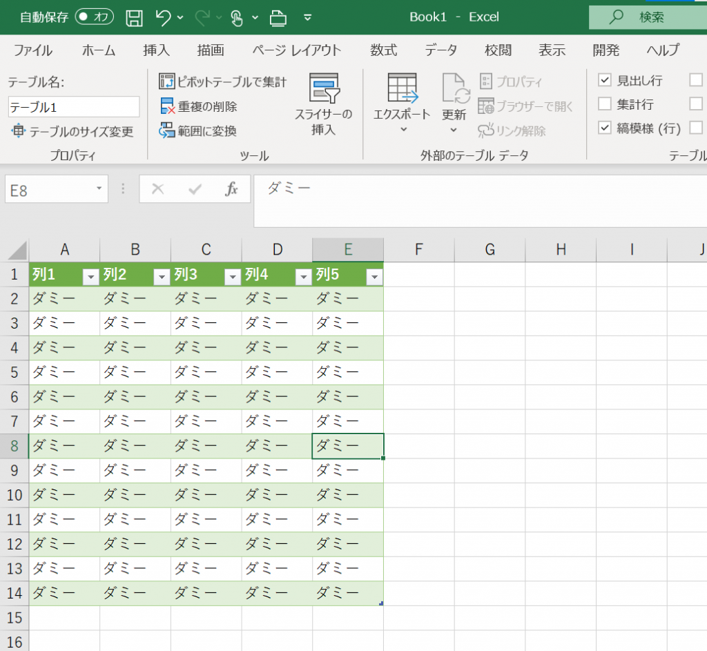 「OK」ボタンをクリックするとこんな感じで「テーブル」形式に変更されます。