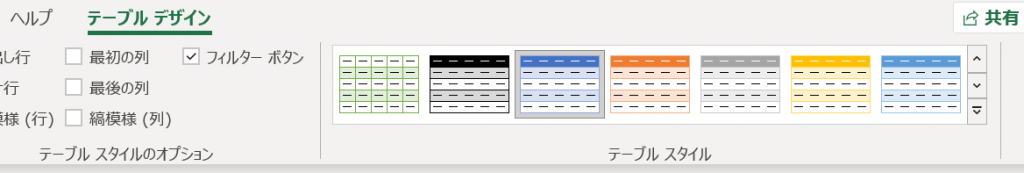 デザインに関してはExcelの画面右上「テーブルデザイン」タブにいろんなパターンが用意されているので自分の好みの色をそこから選択します。