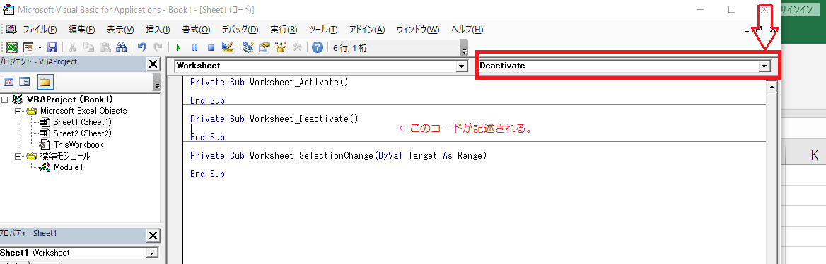 次に<Activate>と<Deactivate>の記述欄に下記のマクロを記載します。