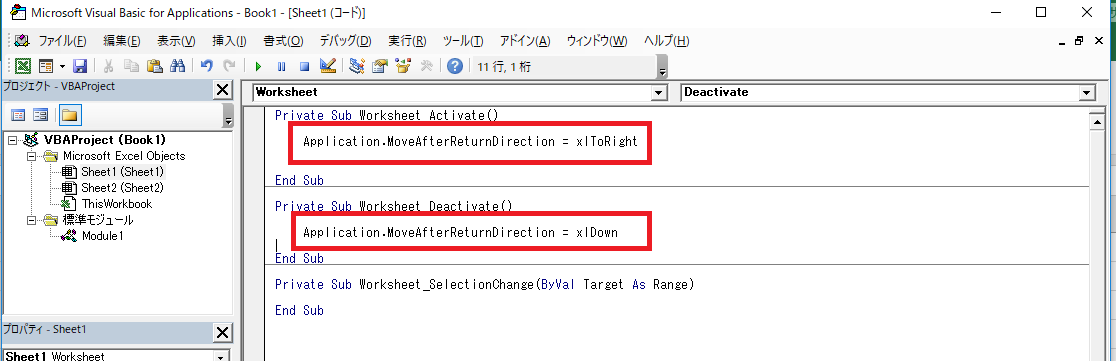これでシート1でのみEnterキーを押すとカーソルが右に進むようになります。