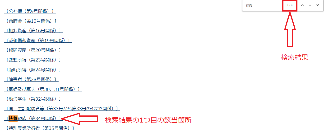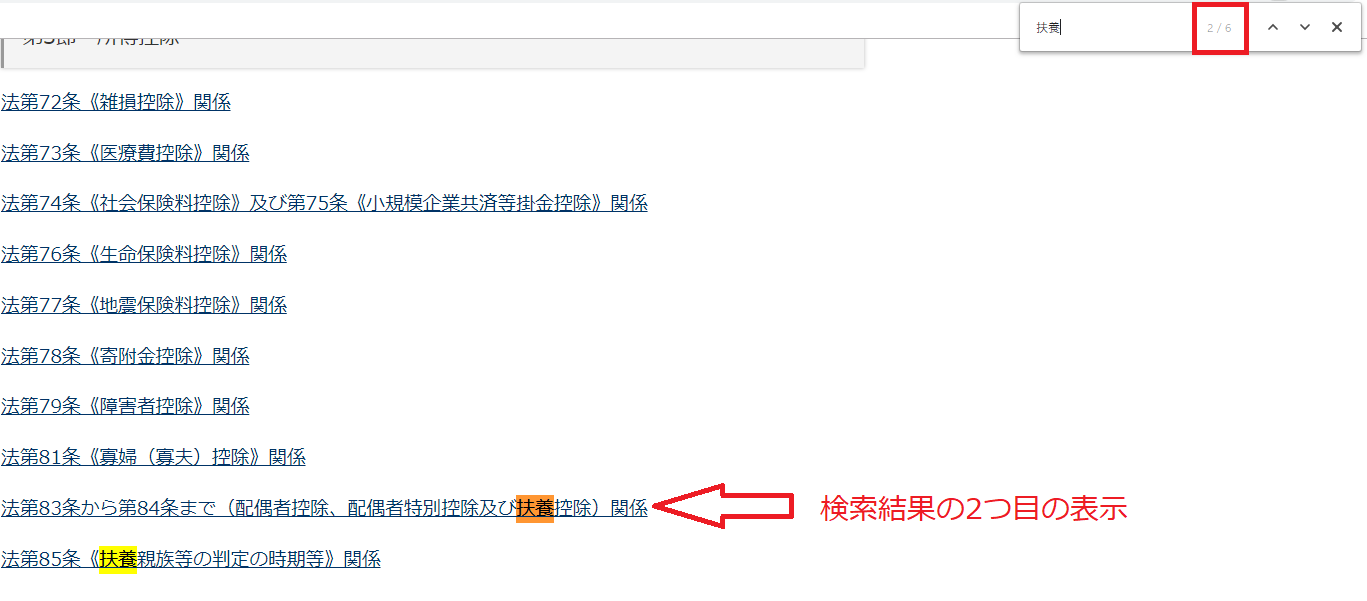 出てきた検索窓に<扶養>と入力してEnterキーを押すと下記のようになります。今回は6件ヒットしたようです。