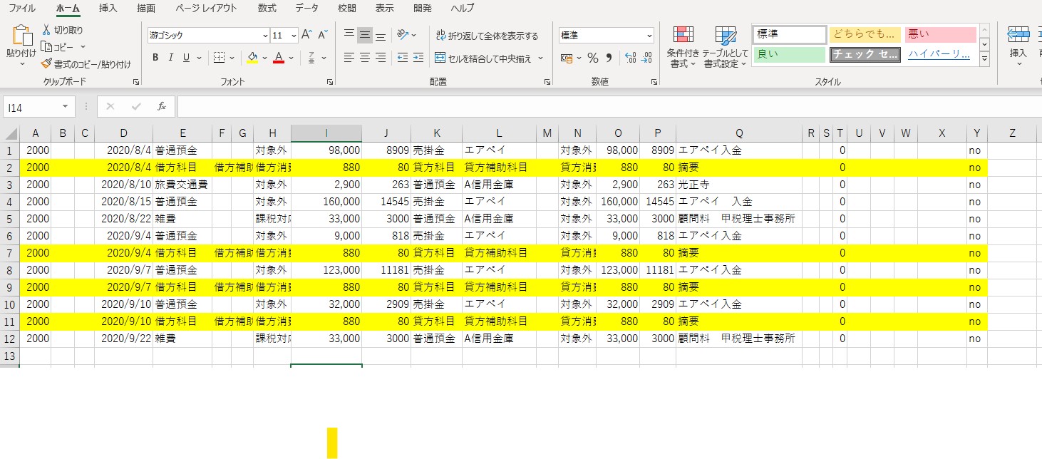 マクロを実行すると下記のようになります。わかりやすいように追加された仕訳を黄色でマークしています。
