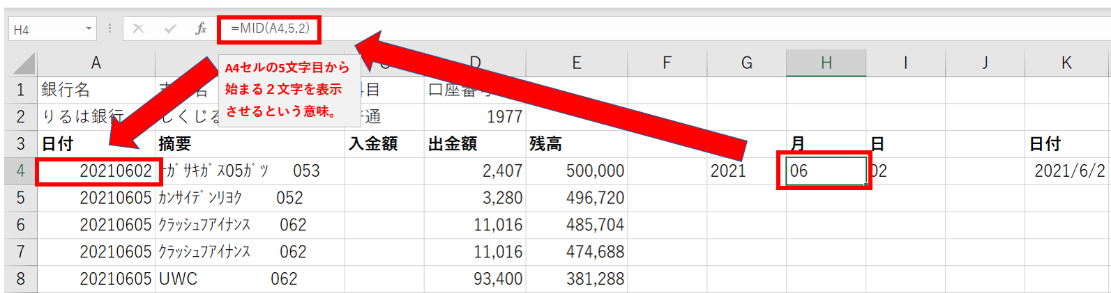 A4セルのデータ「20210602」のうち5文字目である「0」を開始位置として2文字を取得するので結果として06が取得されます。