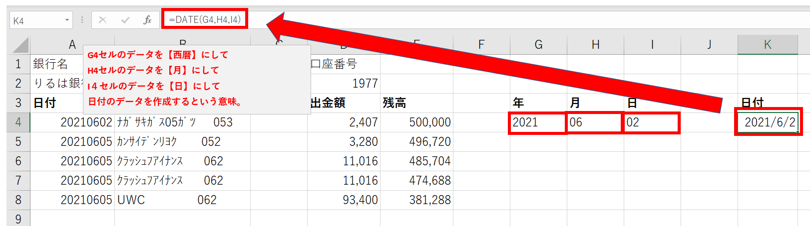 がありますので、これをDATE関数に指定してあげるとK4セルに日付のデータが表示されます。