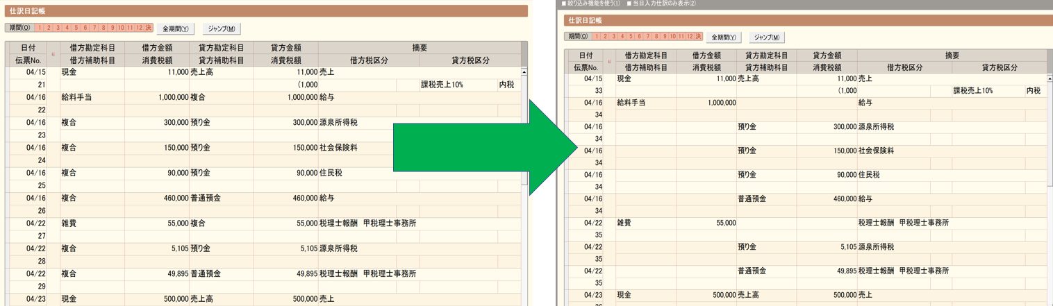 同じ日に大量に取引が発生する場合、振替伝票形式にしても結果として見にくい、俯瞰しにくいものになる可能性があります。