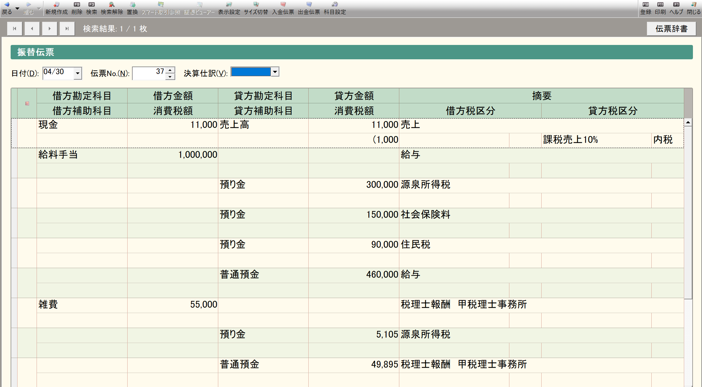 こんな感じで、給与に関する取引と、税理士報酬に関する取引などを別々の振替伝票に分けることができません。