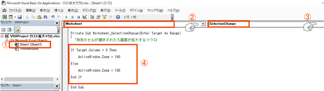 <if target.column=3 then>の<3>を<2>に変更するとB列のセルが選択された場合に画面が拡大するようになります。