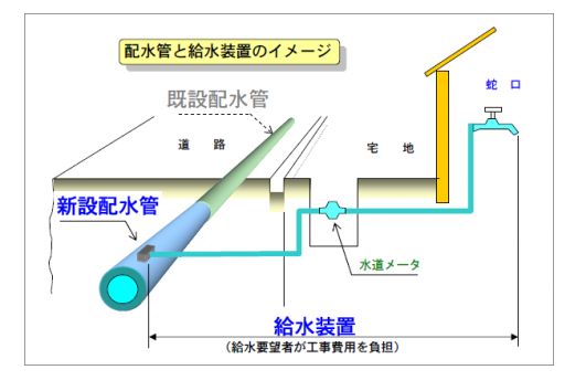 図でいうところの<配水管>から<宅地>まで水道管を引っ張ってくる(引込む)工事のことを言うようです。