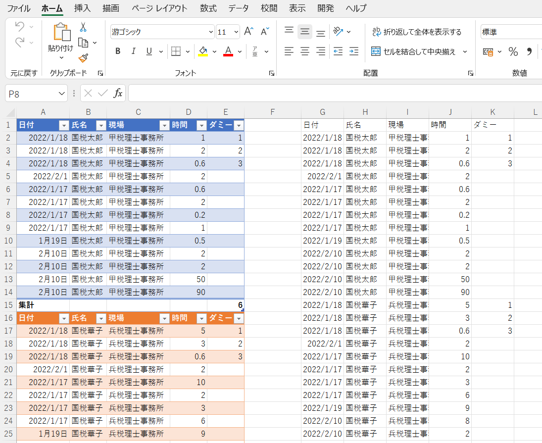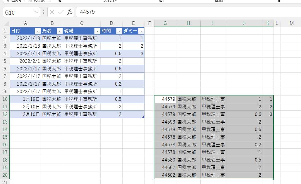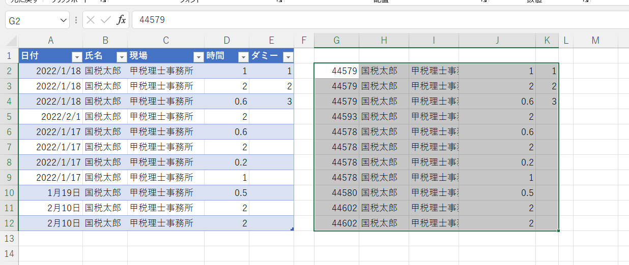この状態で青とオレンジの2つのテーブルからデータ部分のみをG列~K列に集計させてみます。