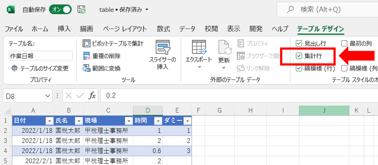 合計行(集計行)に関してはテーブルデザインタブの「集計行」をクリックすると自動で集計行が作成されます↓