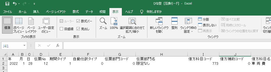 出力したエクセルファイルを開くと下記のように1行目にタイトル行が記載され、2行目以降に実際の仕訳データが出力されているのが確認できます↓