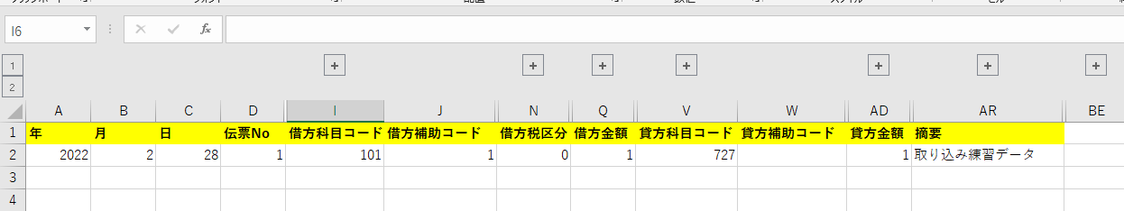 - 借方科目コード(I列に入力 ※建設大臣で登録されている科目コードを入力しないといけない)