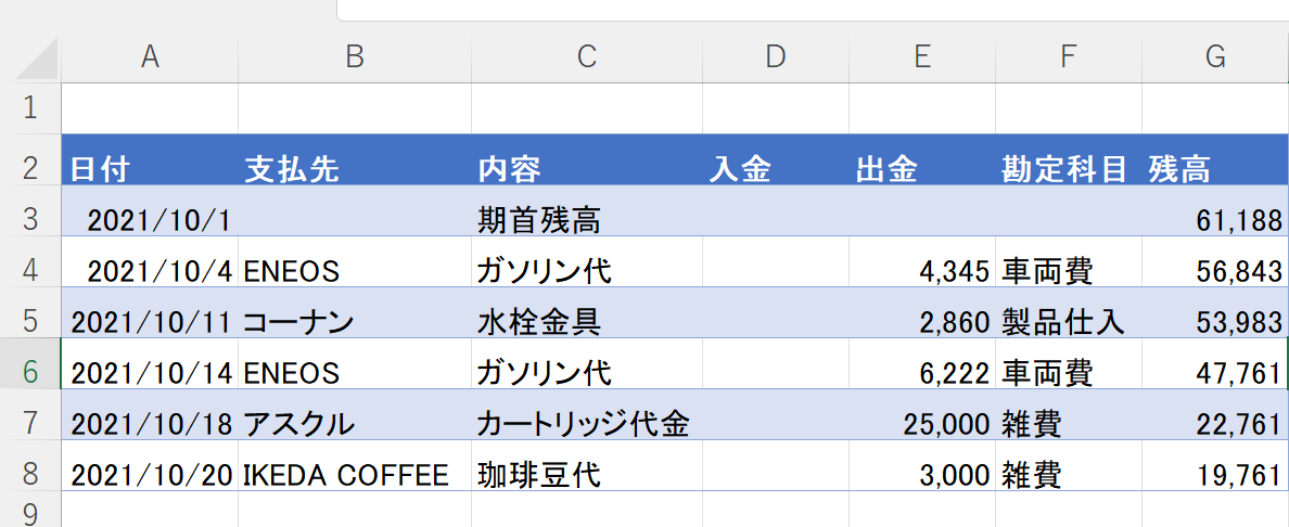 こんな感じのよくある現金出納帳のデータがあるとします↓