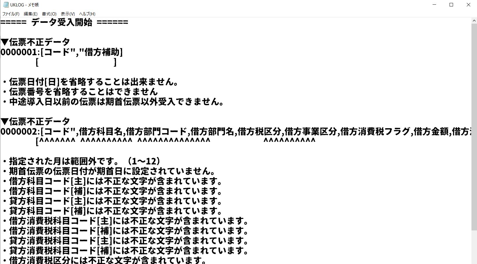 「はい」をクリックするとインポートが開始されます。インポート時にCSVデータに不備がある場合には下記のようなエラーログが出力されますので該当箇所のCSVデータを訂正して、再度インポートを実施しましょう↓