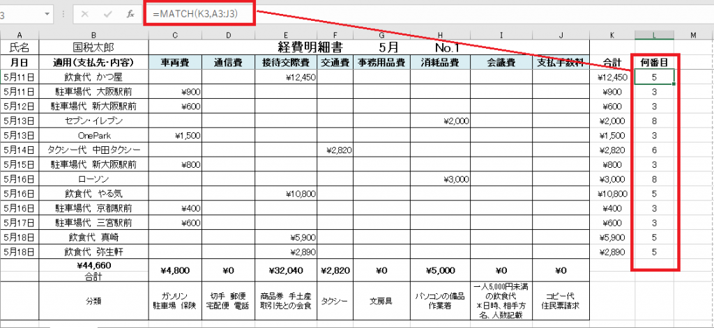 今回はL列にMatch関数を記載して、K列に記載された金額12,450円がA列からJ列までの範囲内で何番目にあるのかを調べています。