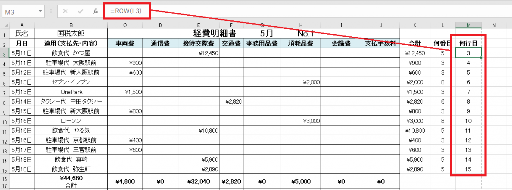 今回はM列にRow関数を記載してL列のデータが何行目のデータかを調べています。