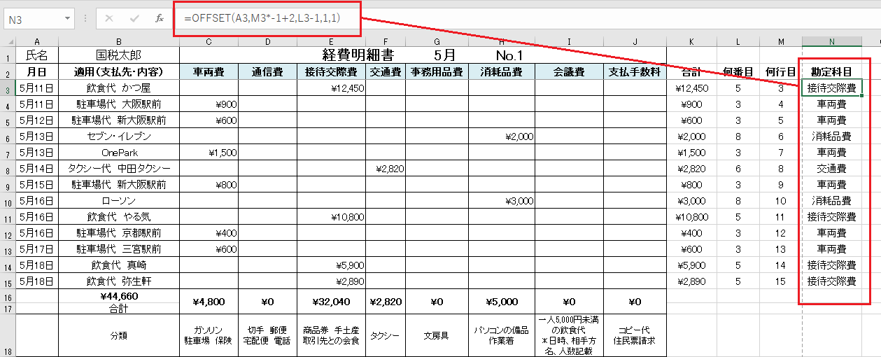 Offset関数で対応する勘定科目を引っ張ってくる。