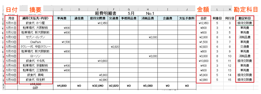 <勘定科目(借方)>と<支払金額>についてはこのままでは使えそうにないです。