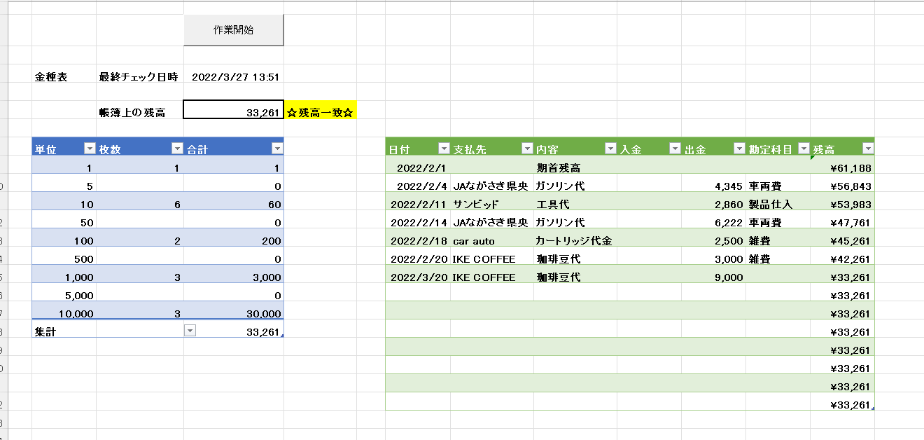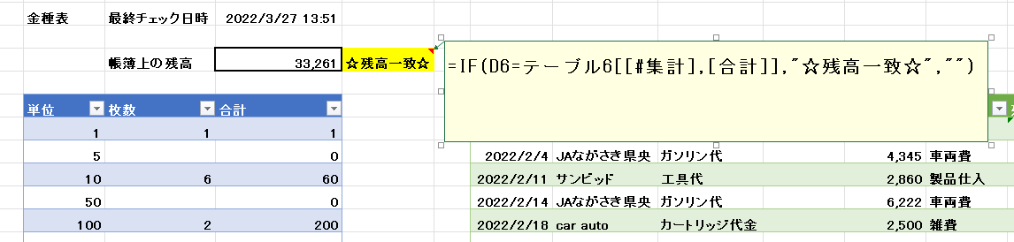 また、「左側のテーブルに記載した金額の合計額」が「左側の帳簿上の残高」と一致した場合にはセルに「☆残高一致☆」と表示されるようにしています↓