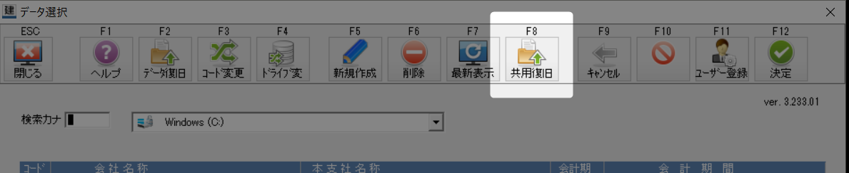 新しいパソコンで建設大臣NXを起動して「F8共用復旧」ボタンをクリックします↓