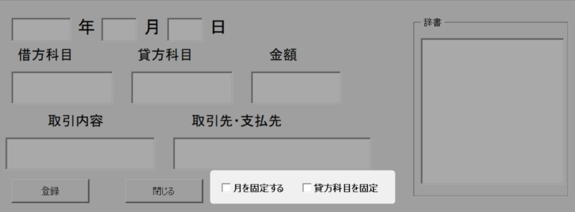 ユーザーフォームのチェックボックス機能で日付と勘定科目を固定する機能を追加する