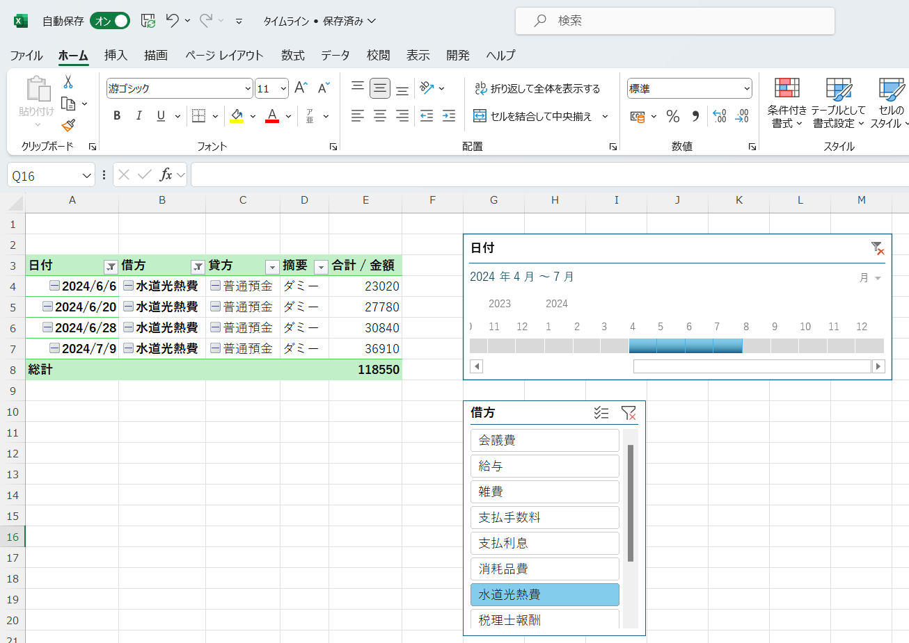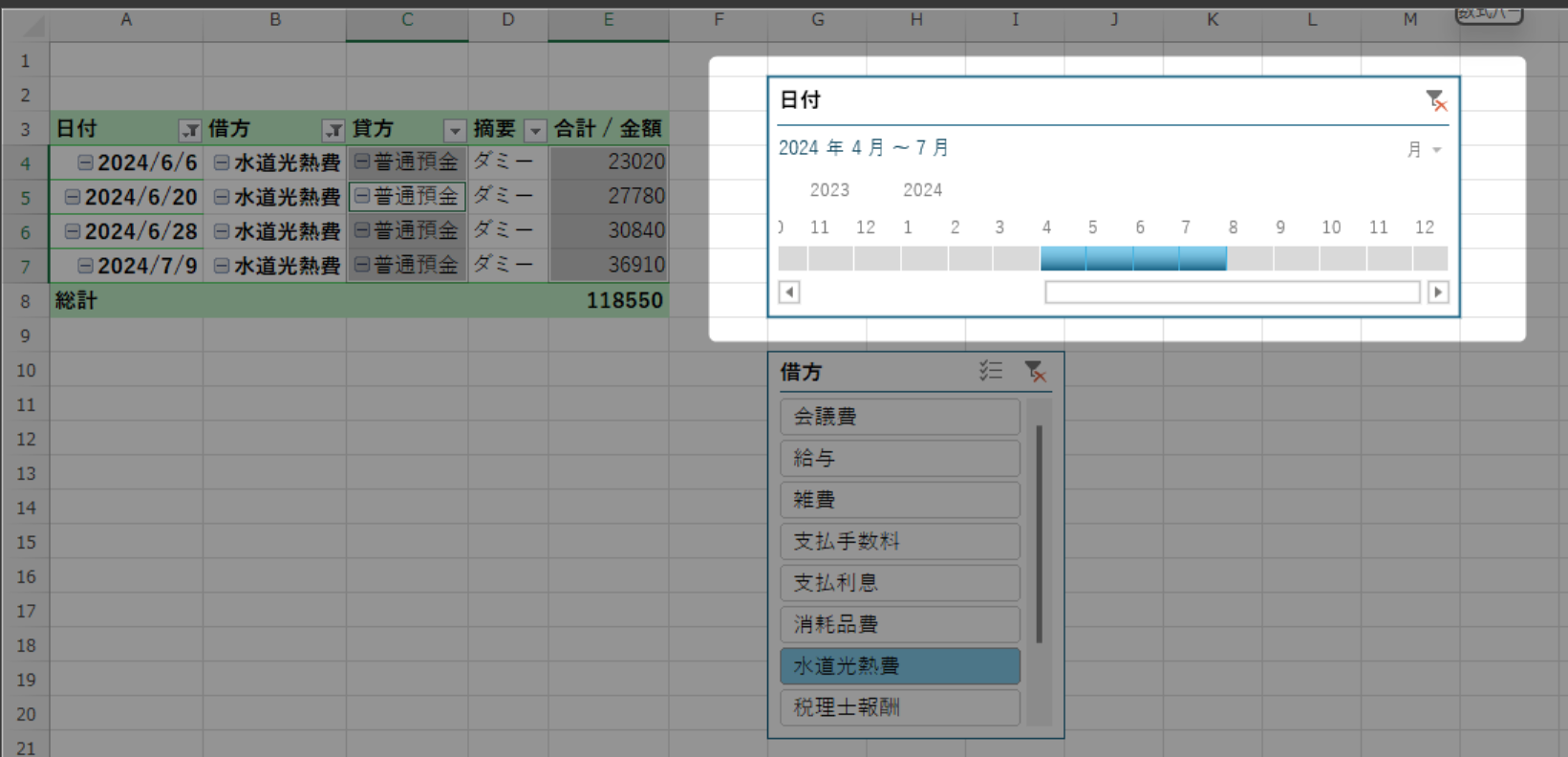 タイムラインの「バー表示」されているところからクリックやドラッグして「月などを絞り込む」ことで結果をピボットテーブル上に表示してくれる機能です。(上の画像では2024年の4月~7月までの水道光熱費のデータを絞り込んで左側のピボットテーブルに表示している状態になります)