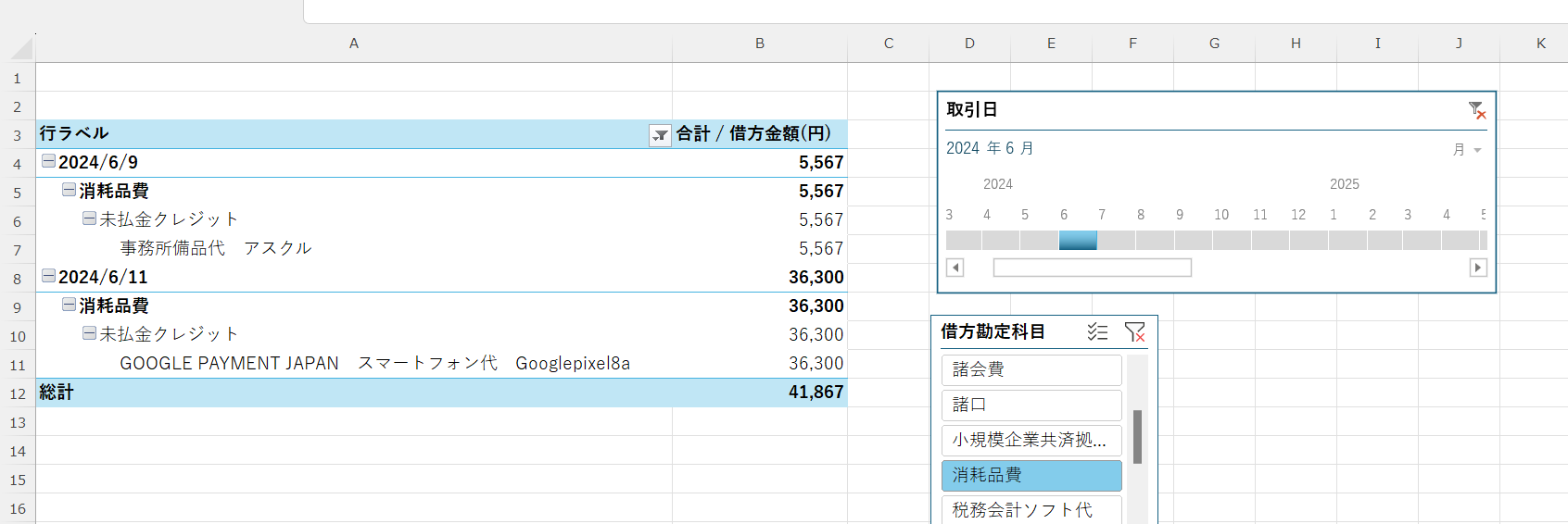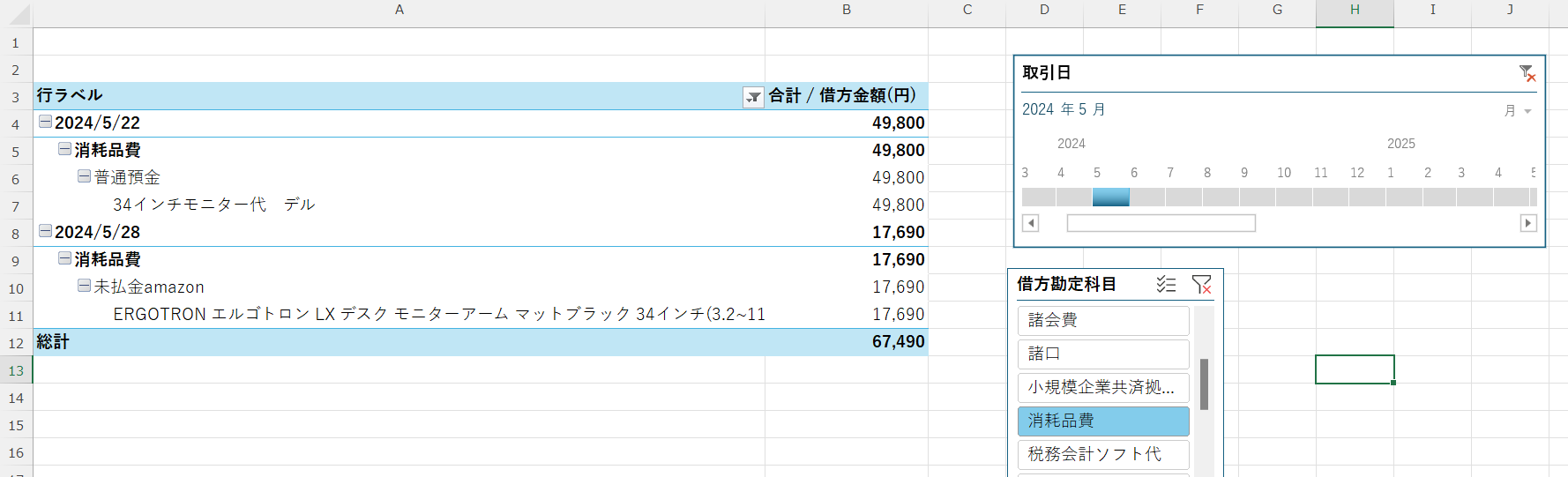 といった作業をすることでピボットテーブル上に2024年5月の消耗品費の取引データを表示することができるようになります。