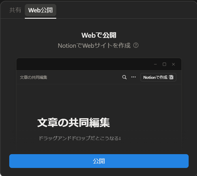例えば作成した文章(ページ)などの途中経過や最終確認などを管理職の立場にある人にしてもらう場合にはNotionのWebで公開という機能を使うことで共有することができます。