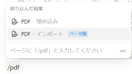 ページ上で「/pdf」と入力して「PDF 埋め込み」というメニューを選択して、埋め込みたいPDFを選択するだけです↓
