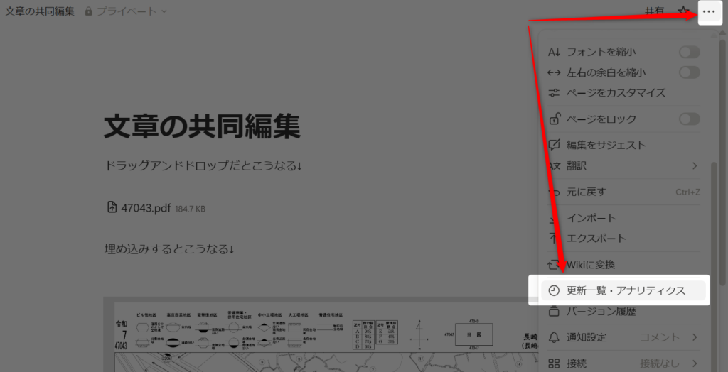 ページの右上の「・・・」をクリックして表示されるメニューの「更新一覧・アナリティクス」を選びましょう↓