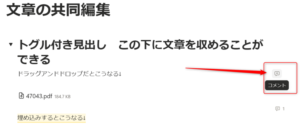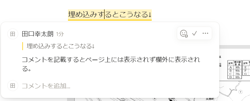 Notionにはコメント機能があり、文章に対して直接ページ上に記載するのではなく、ページの外部に表示することができます。