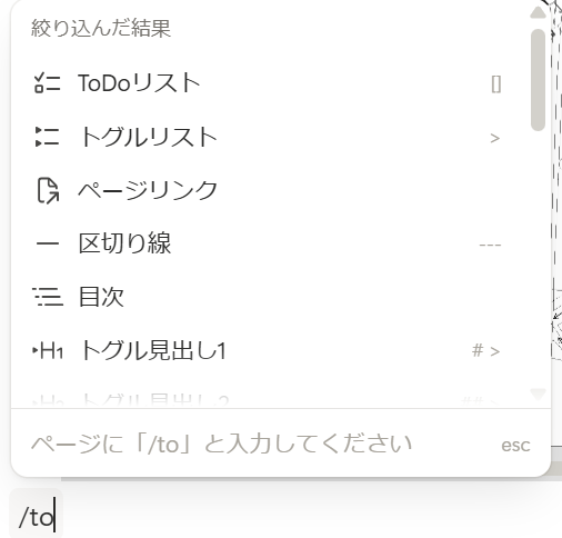 Notionのページ上で「/to」と入力してトグル見出しを選択しましょう。