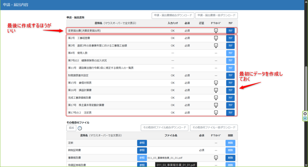 作業して感じた注意点としては、いきなり変更届出書(の表紙データ)を作成しないほうがいいということです。