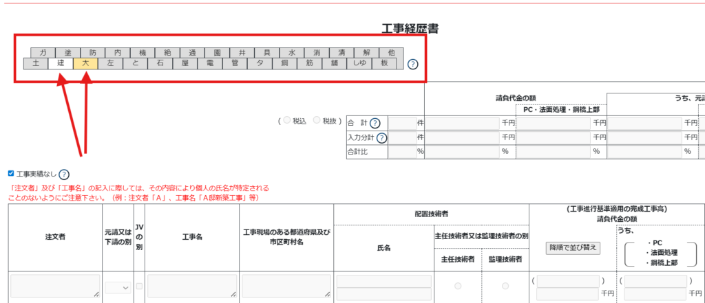 「大工工事に関する工事経歴書」と「建築工事の工事経歴書」の2つを作成する場合には画面上で業種を切り替えてから作成するのを忘れないようにしましょう。