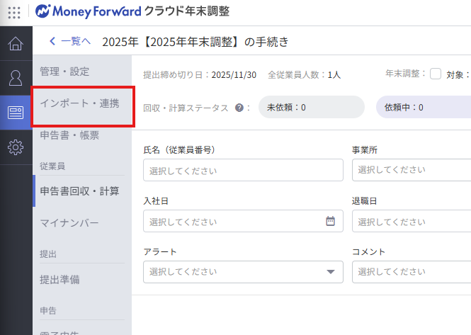 選択した年末調整業務のメニューから「インポート・連携業務」をクリック。