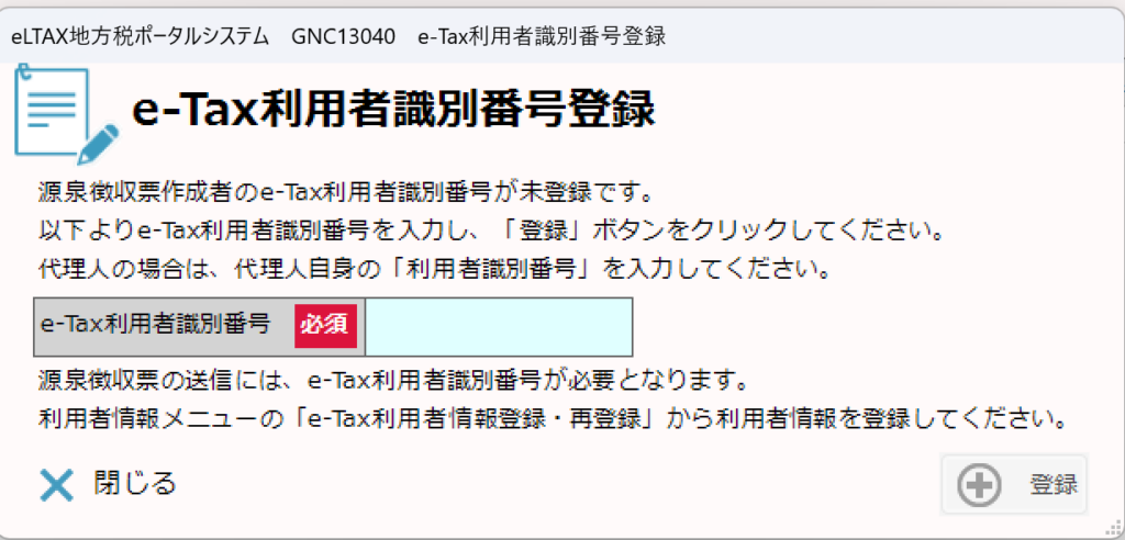 こんな感じで税務署提出用に利用者識別番号などを入力するように求められます(未登録の場合)↓