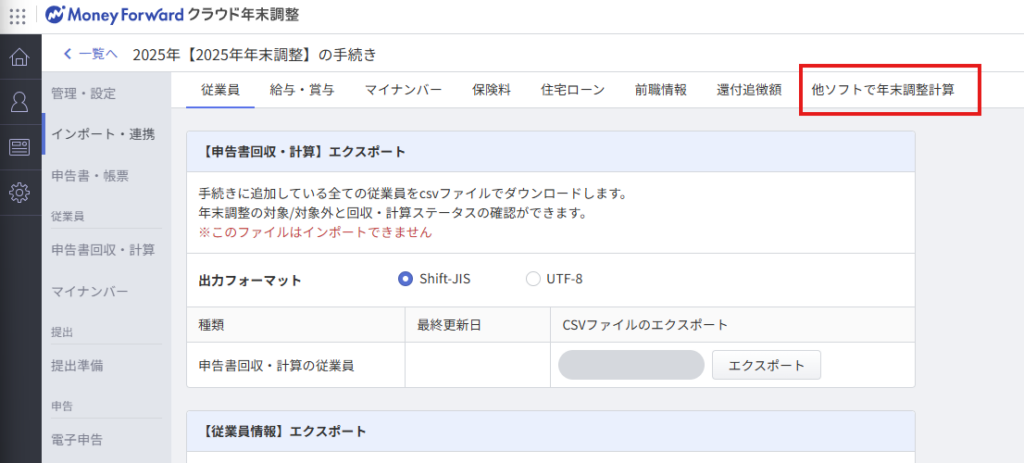表示された画面から「他ソフトで年末調整計算」タブをクリック