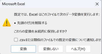 Excelを起動した際に、先頭の0を削除するといったメッセージが表示される場合がありますが、この状態でデータを変換してしまうとPCdeskにエラーが発生する可能性があるので、