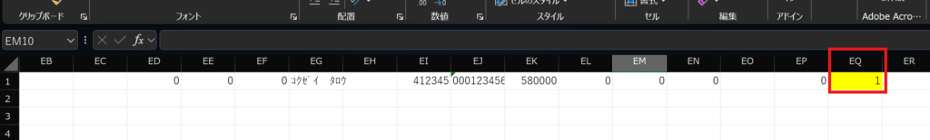 表示されたExcelの一番右のデータのEQ列(147列目)のデータが「2」になっているところを「1」に変更します。