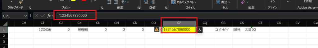 なのでCP列をクリックして先頭に半角の「’(アポストロフィ)」のマークを入力します。