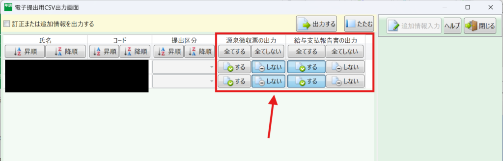 データを出力する際にも、給与支払報告書「のみ」のCSVデータを出力するのか、それとも源泉徴収票のデータ「も」出力するのかを選択することができます↓