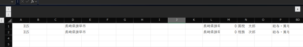1行目が「国税太郎」さんの給与支払報告書のデータで、2行目が「税務 次郎」さんの給与支払報告書のデータであることが確認できます。