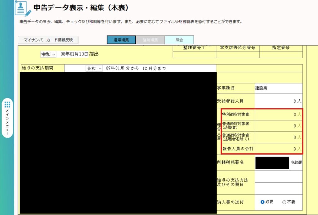 報告人員欄の「特別徴収対象者」の欄が「3人」と記載されています。